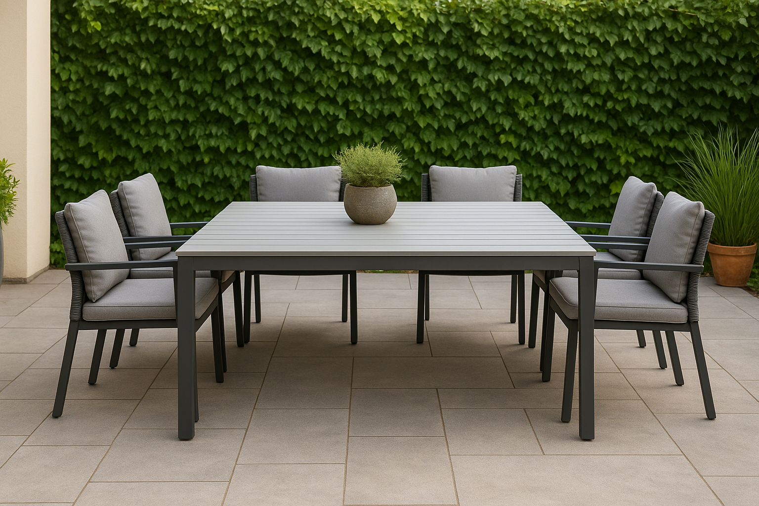 Wybór zależy od charakteru ogrodu. W nowoczesnych, geometrycznych aranżacjach często spotyka się modele z wyraźnie prostym, minimalistycznym blatem, takich jak nowoczesny zestaw na taras do wspólnych posiłków, który dobrze komponuje się z liniami pergoli i zabudowy tarasu.